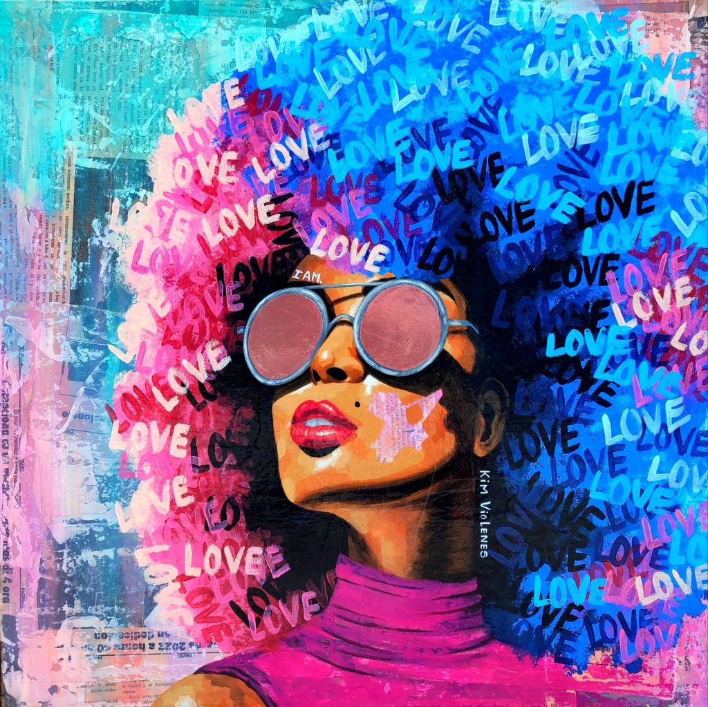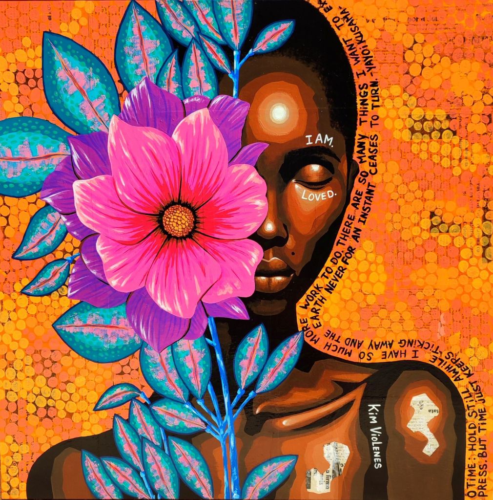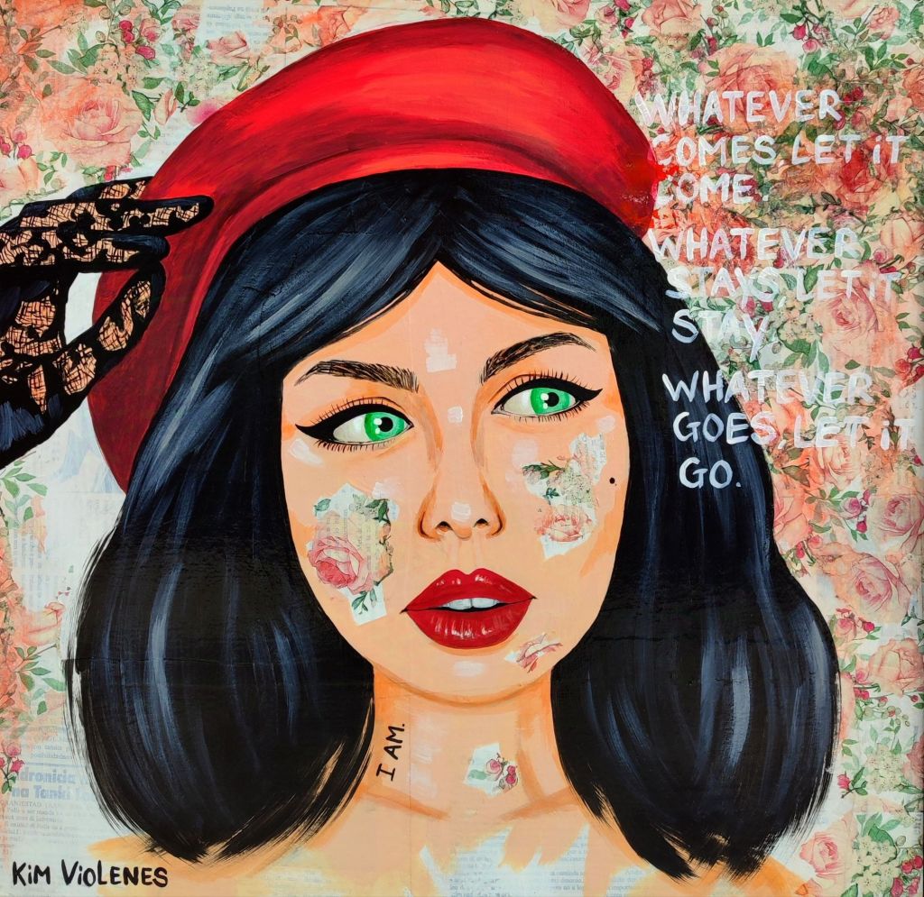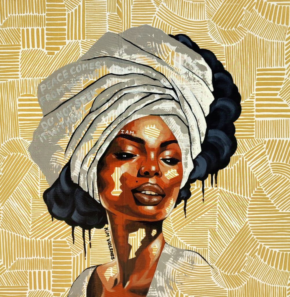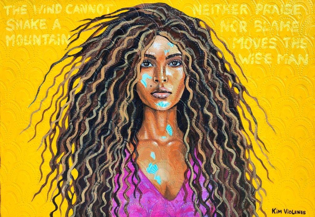 Many of the portraits include a small but meaningful detail: a beauty mark above the lip, mirroring Kim’s own, weaving a thread of personal connection into the work. Also all the characters have the “I AM” painted on their bodies.Throughout the series, she incorporates inspiring quotes that resonate with her, adding layers of thought and meaning to each piece.