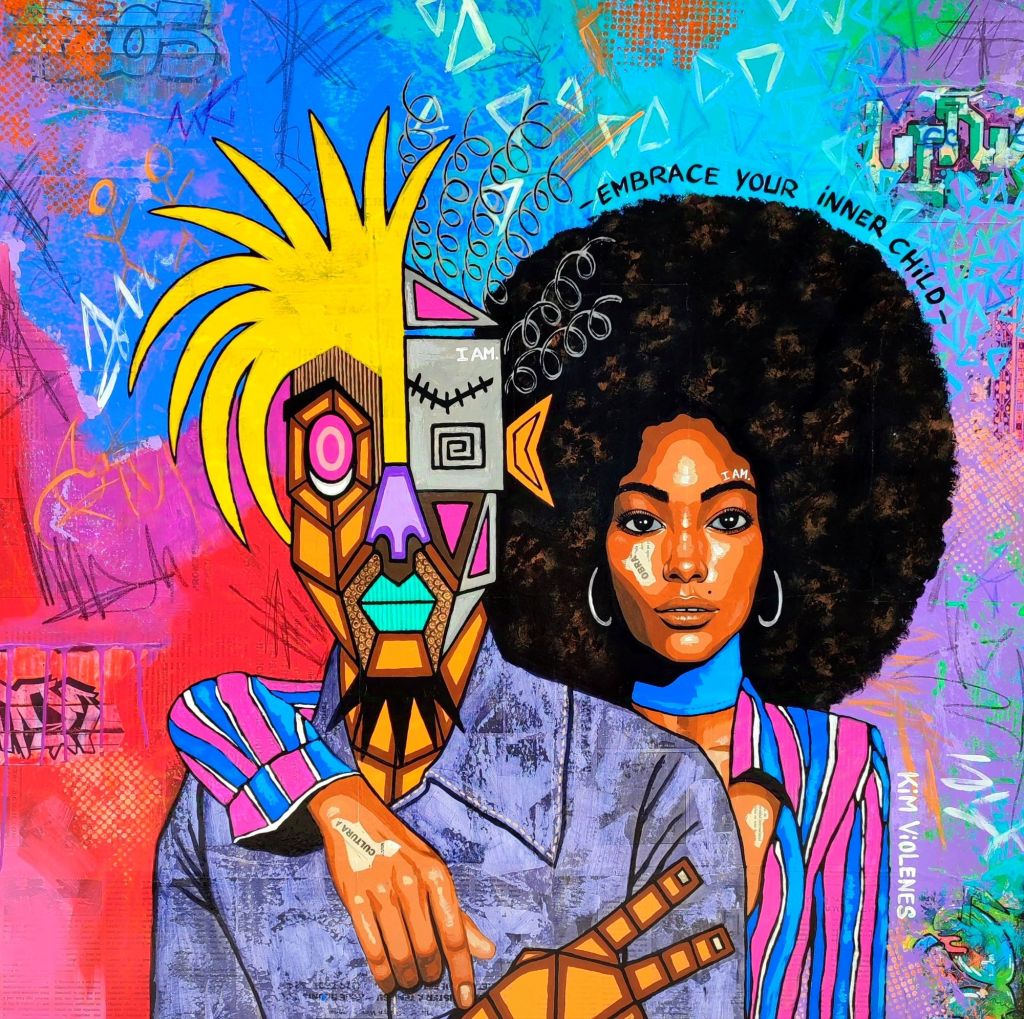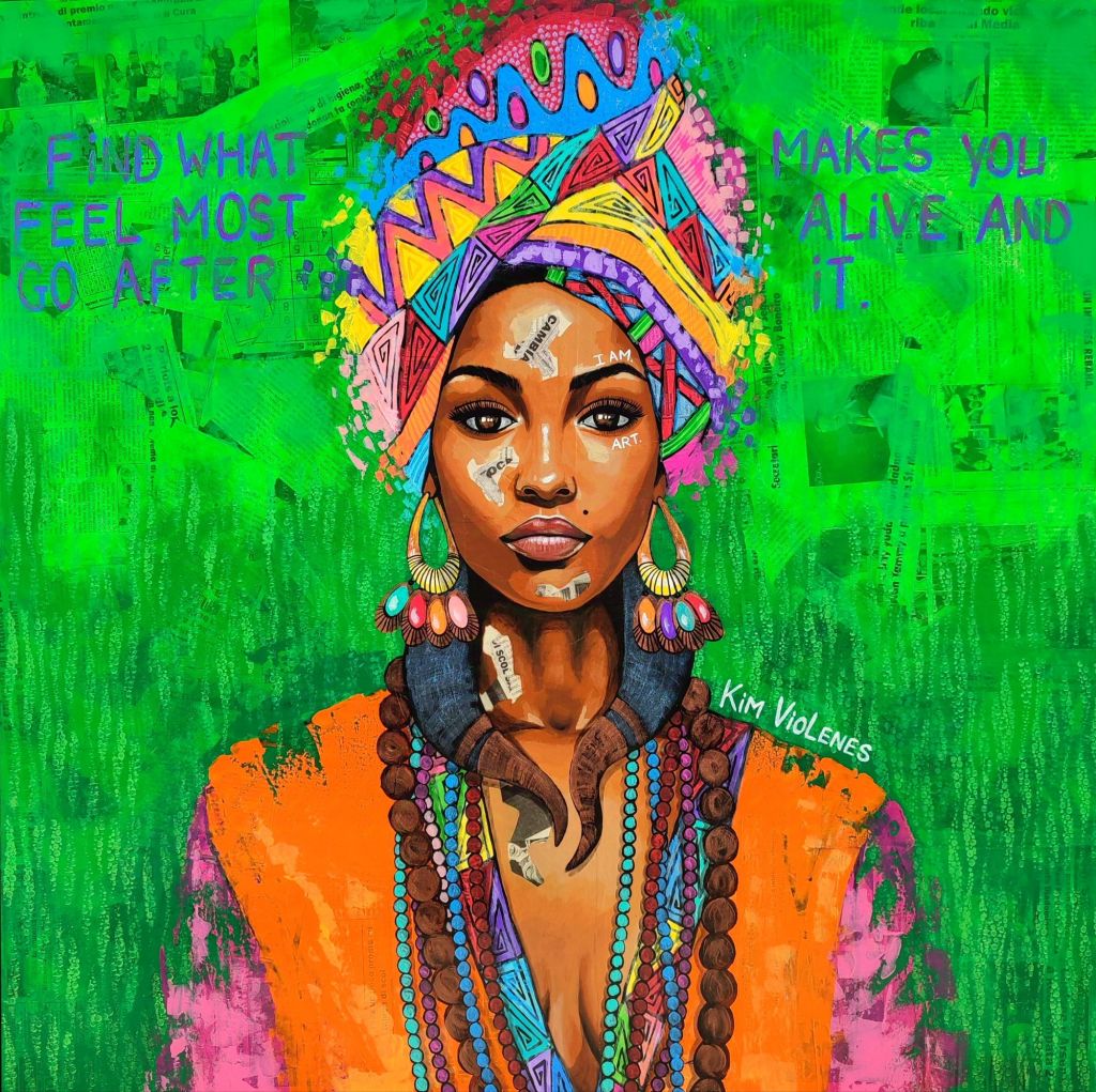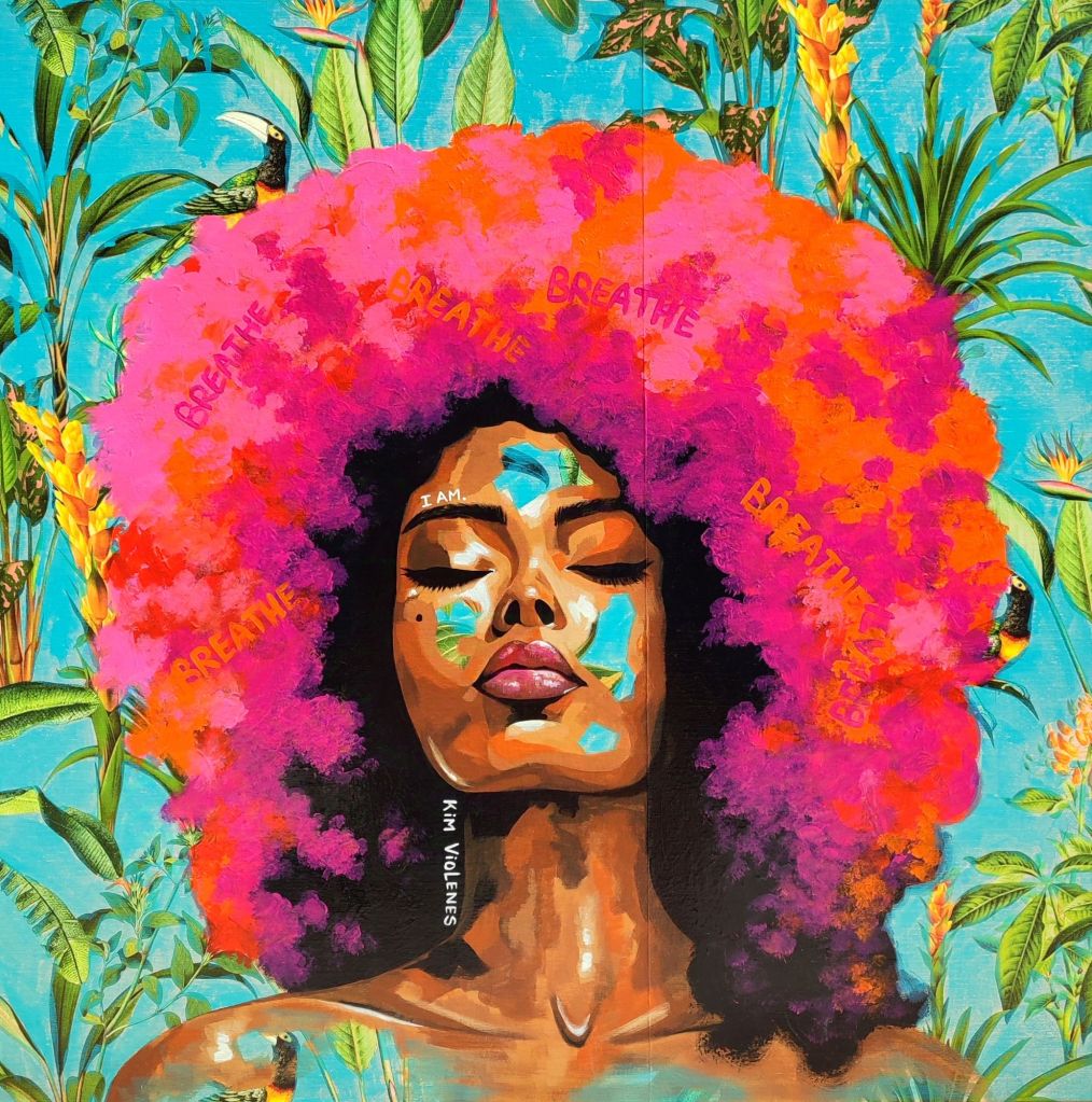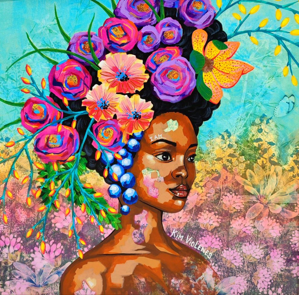 Many of the portraits include a small but meaningful detail: a beauty mark above the lip, mirroring Kim’s own, weaving a thread of personal connection into the work. Also all the characters have the “I AM” painted on their bodies.Throughout the series, she incorporates inspiring quotes that resonate with her, adding layers of thought and meaning to each piece.